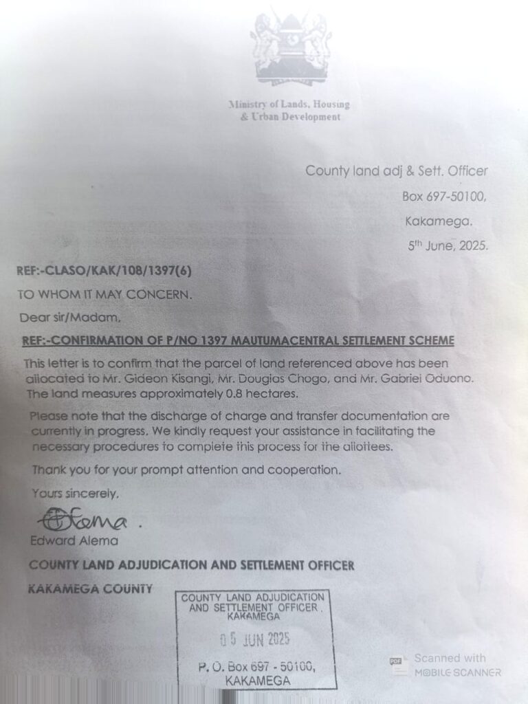 However, a land adjudication report dated June 5, 2025, seen by SHAHIDI TV, appears to contradict the county’s position. It shows that the supposed alternative land in Mautuma Settlement Scheme, parcel number 1397 is already occupied by three individuals: Gideon Kisangi, Douglas Chogo, and Gabriel Oduono, and measures less than one hectare, far smaller than the Mavisi land in Mutembe.